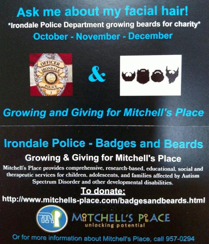 A quick reminder of another worthy cause: The Irondale Police Department is raising funds through the end of this month to benefit Mitchell’s Place through their Badges & Beards charitable fund raiser.