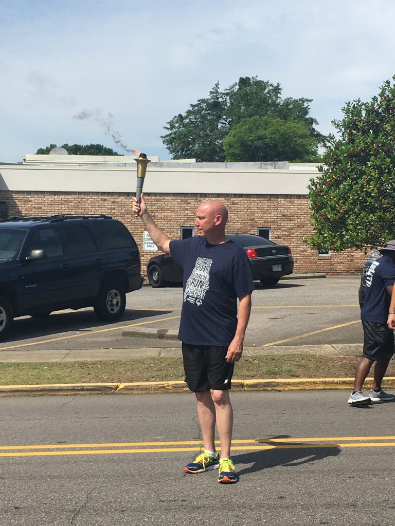 Irondale Police Chief, Ken Atkinson leads Irondale leg of Torch Run.